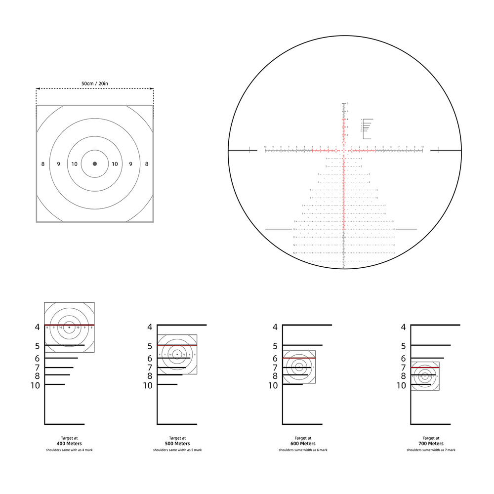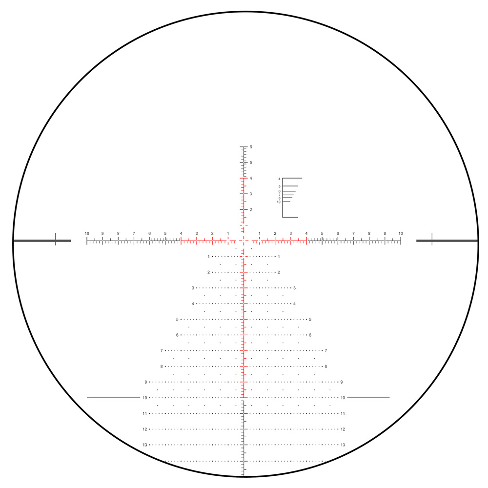 The manufacturer has equipped the scope with a VET-MBR 2 reticle featuring a red illuminated aiming point in the first focal plane (FFP). It has lines corresponding to the given MIL value regardless of magnification. This is possible due to the reticle’s position in the first focal plane, meaning it scales according to the magnification range.