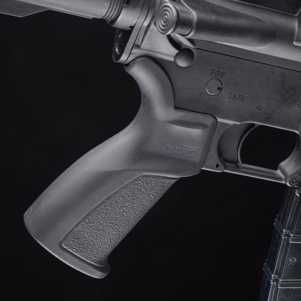 Rubberized pistol grip DLG-138 for AR-15 compatible rifles. The polymer body is rubberized and shaped at an angle characteristic of the AR platform. It has an external texture that improves hand control when operating the rifle with tactical gloves, a raised hand guard.